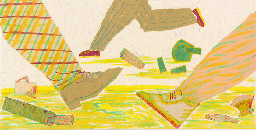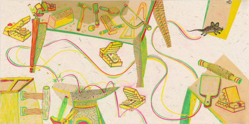 那几年在敦煌,睁开眼从北朝到五代,闭上眼是菩萨与天人。直至某次,在连续研究参观洞窟数天后灵光乍现:为何不运用眼前敦煌的用色之法呢?用有限的颜色创作出新的色感,贯穿到这套创作中。于是在绘画拼贴的基础上,以三色组织创作画面。运用上自己制作的矿物质颜料,这种石绿在原作上带来了雅致。用皮纸宣纸拼贴是我的一种习惯,原因一是这在手边最为方便,二来中国宣纸本身的质感是独一无二的。当你启程时,即使目的地是一片未知,但每一步会越来越靠近它。在不断尝试与调试后,逐渐促成了《三个朋友》的现有风格基调。可能它并不尽所有人的意愿,但至少对我来说,它不是陈词堆砌。这样的绘画探索对于个人插画创作而言,提供了一种全新的图像经验。