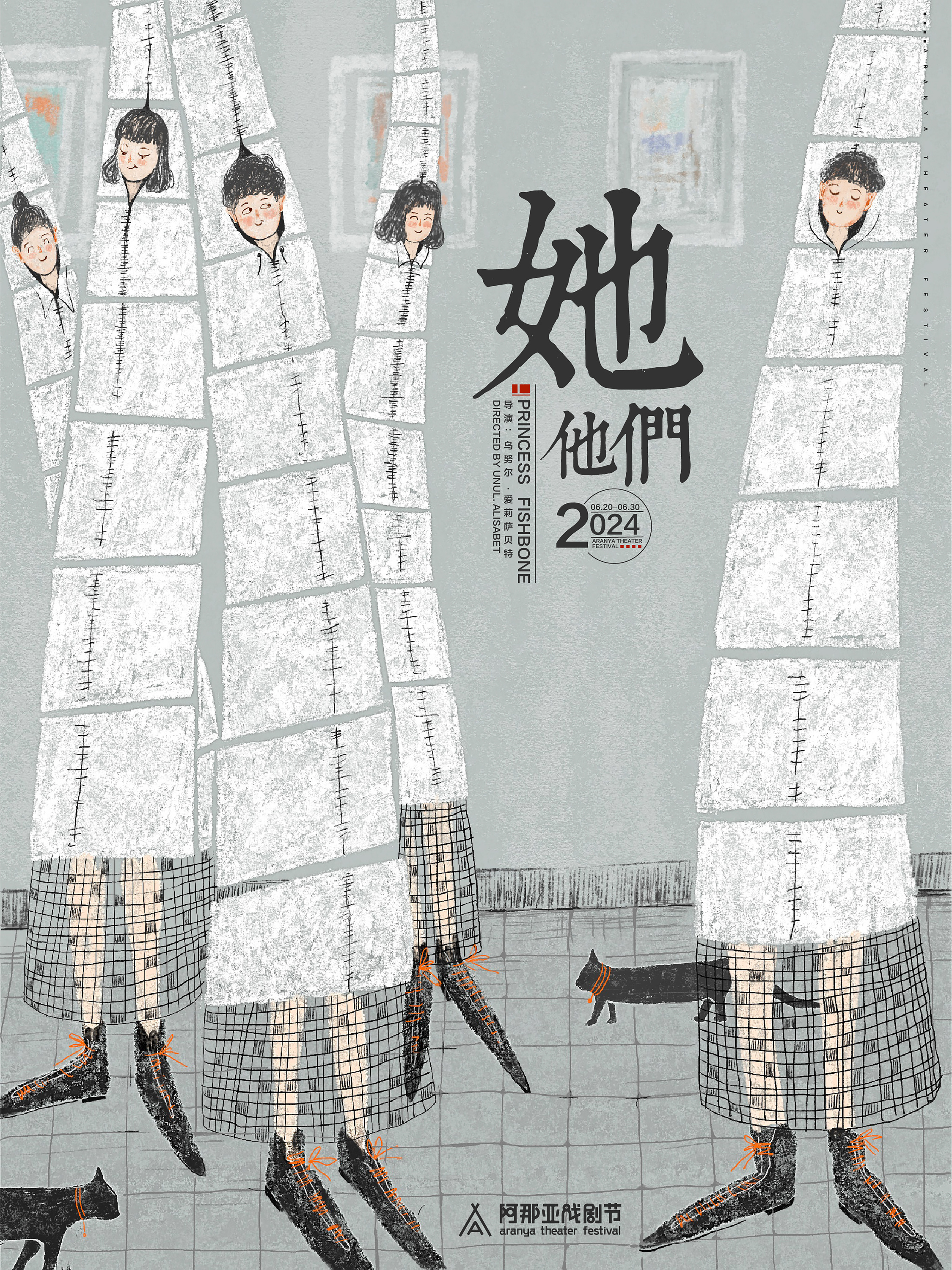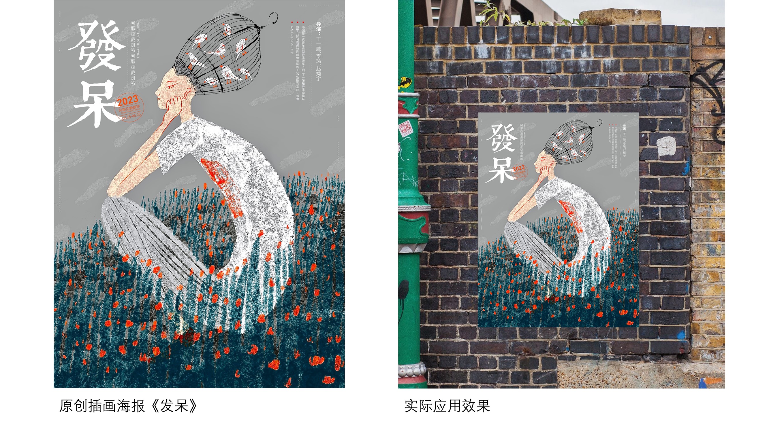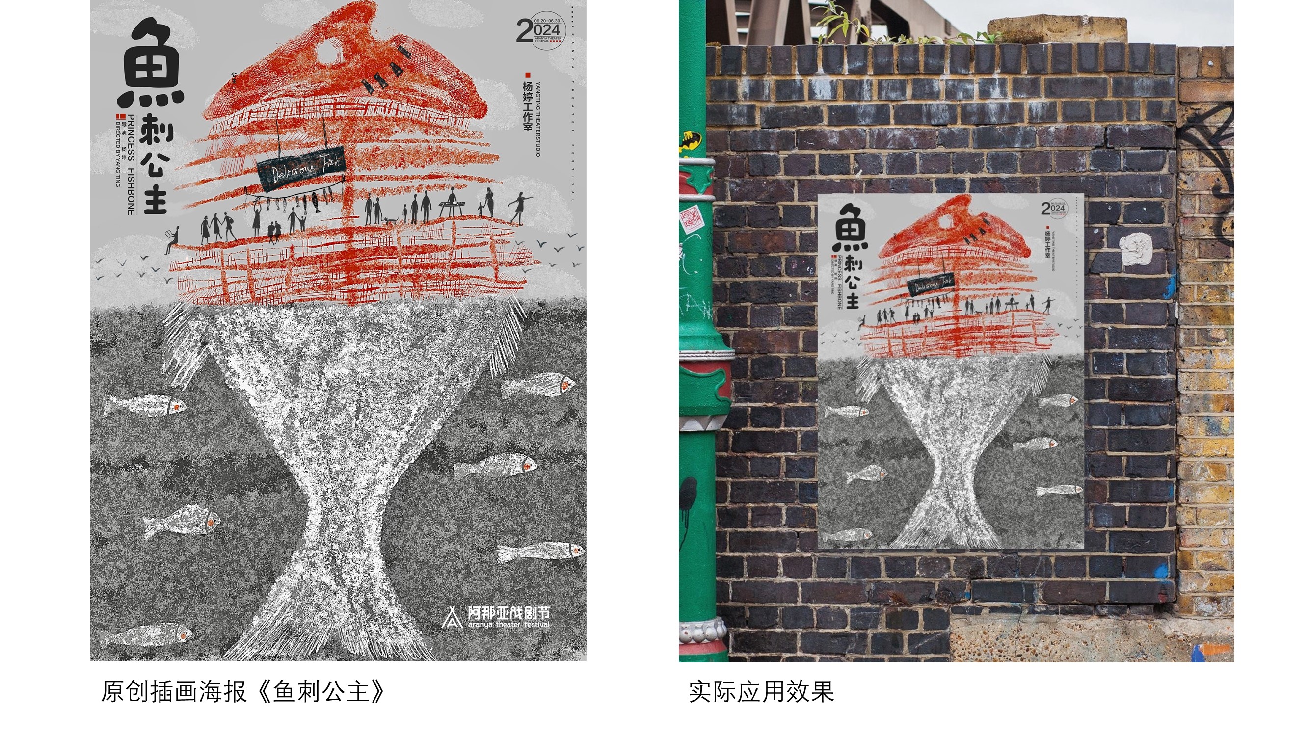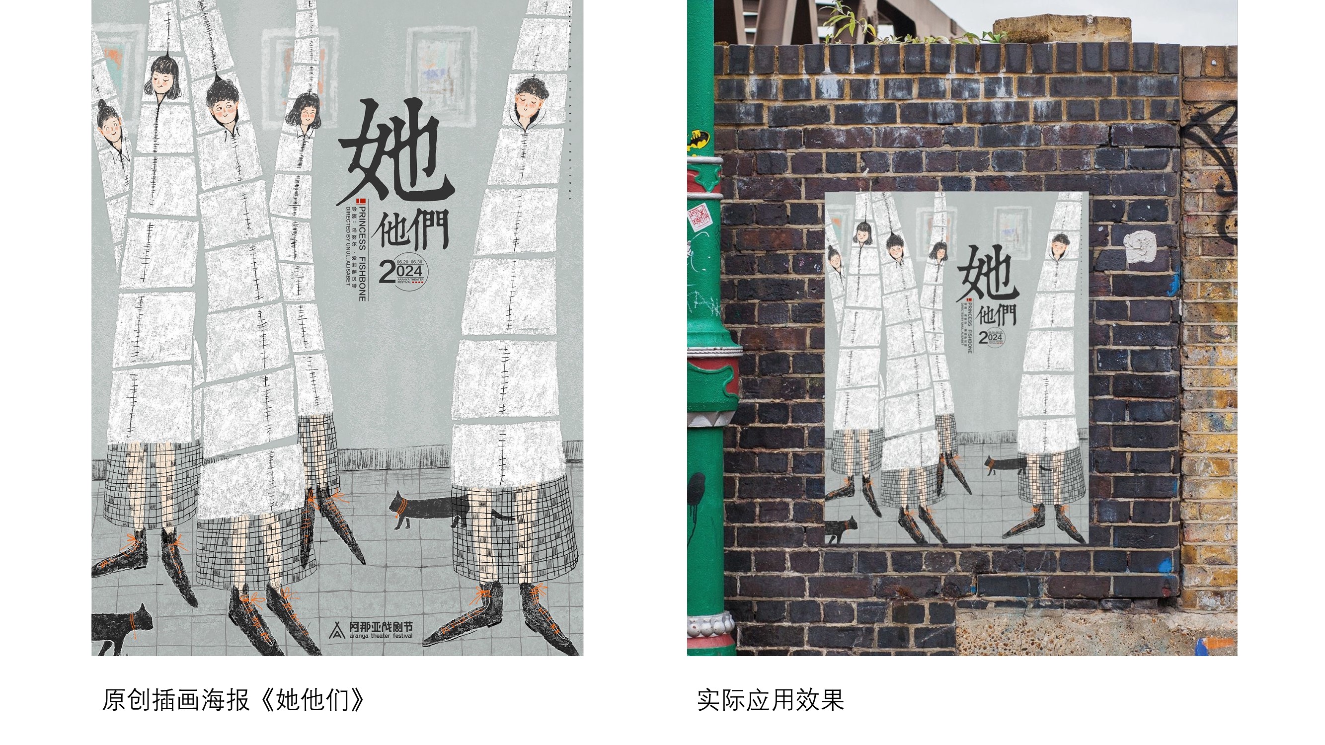受小红书平台委托为阿那亚戏剧节绘制的一系列海报:《她他们》《魔幻玩具城》《鱼刺公主》《发呆》。