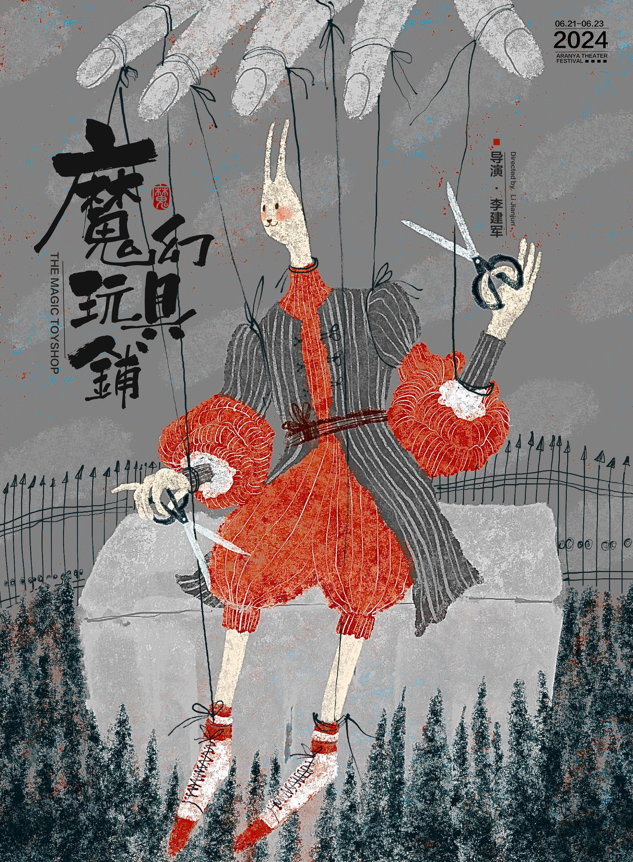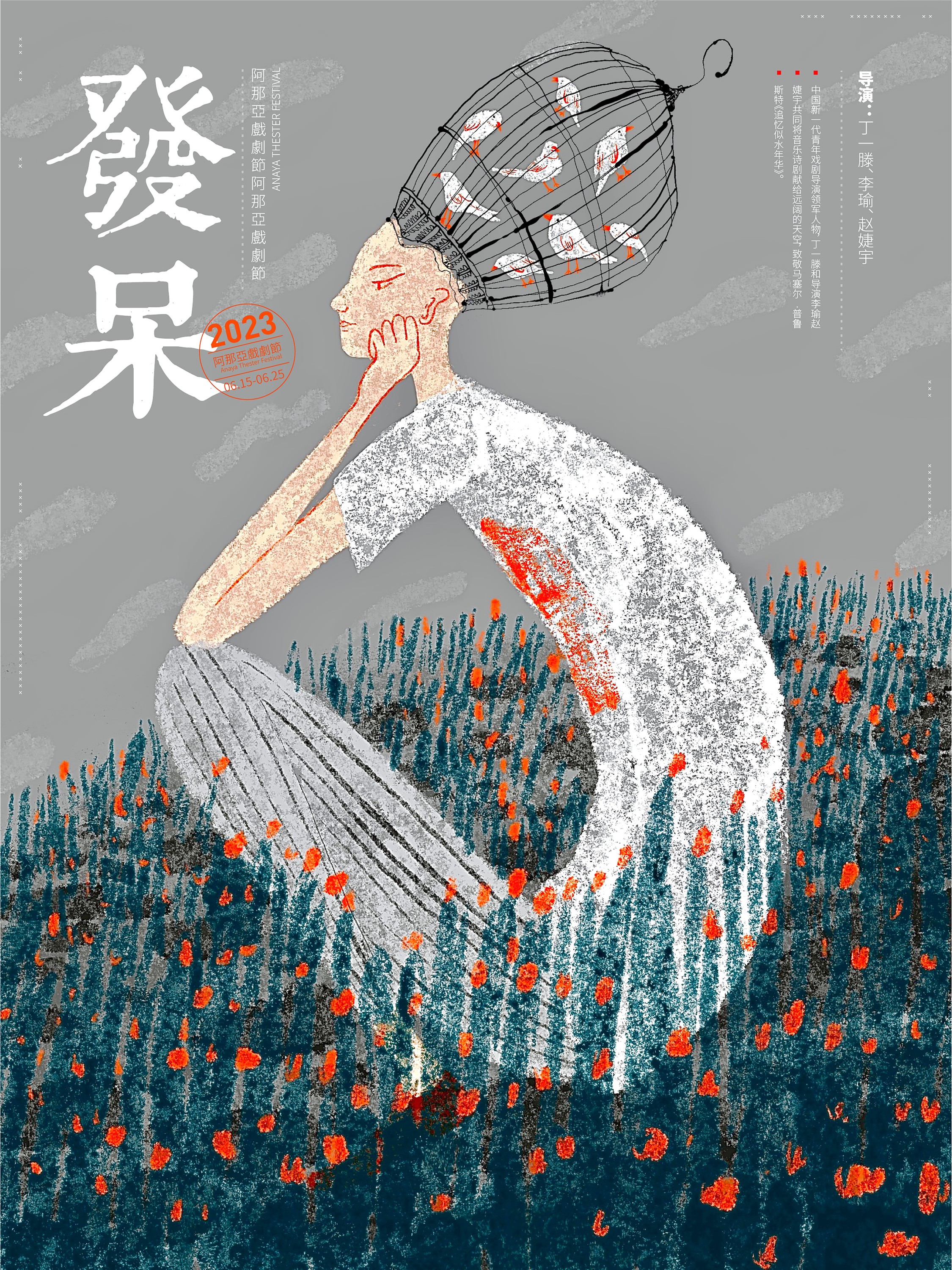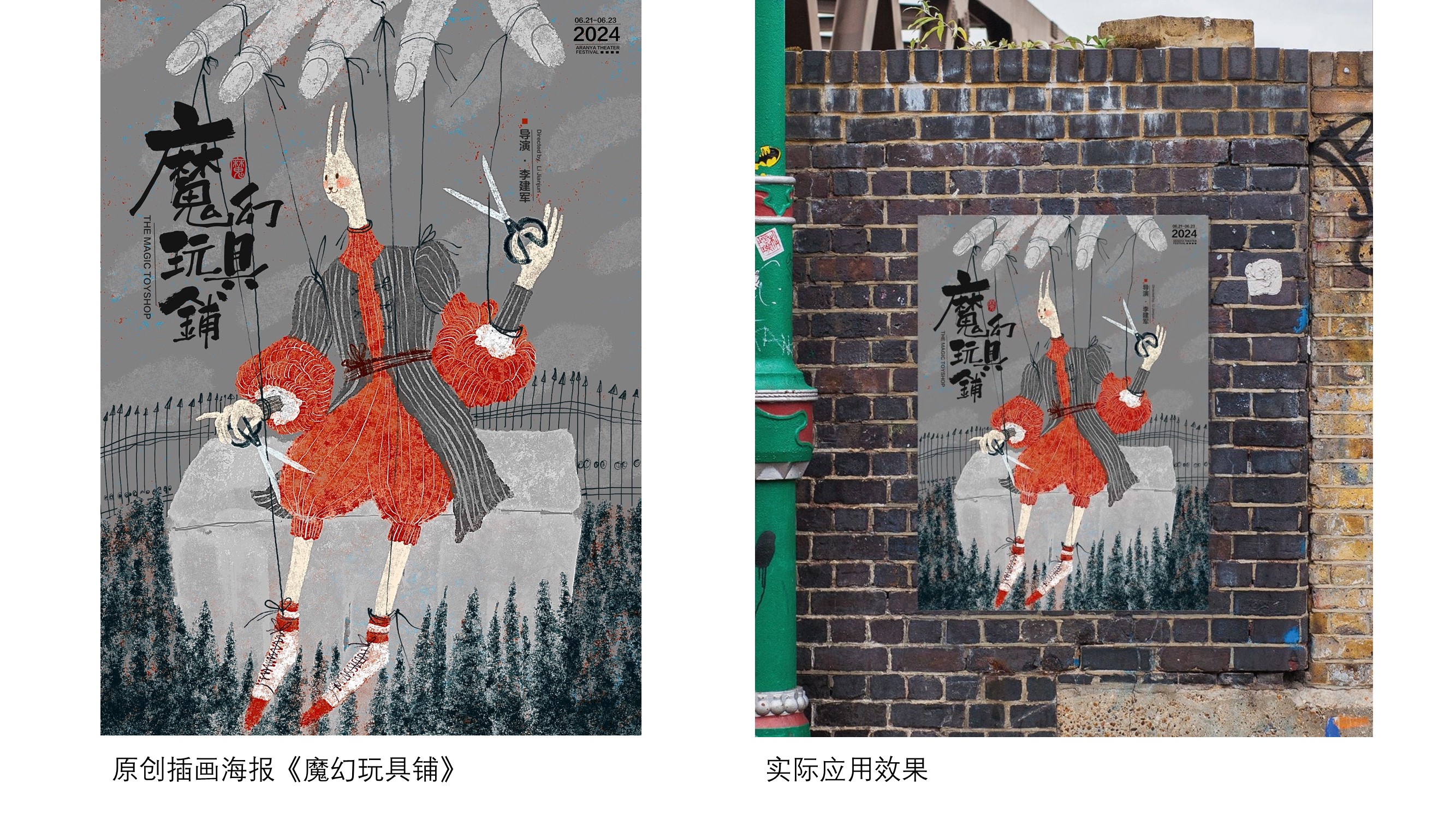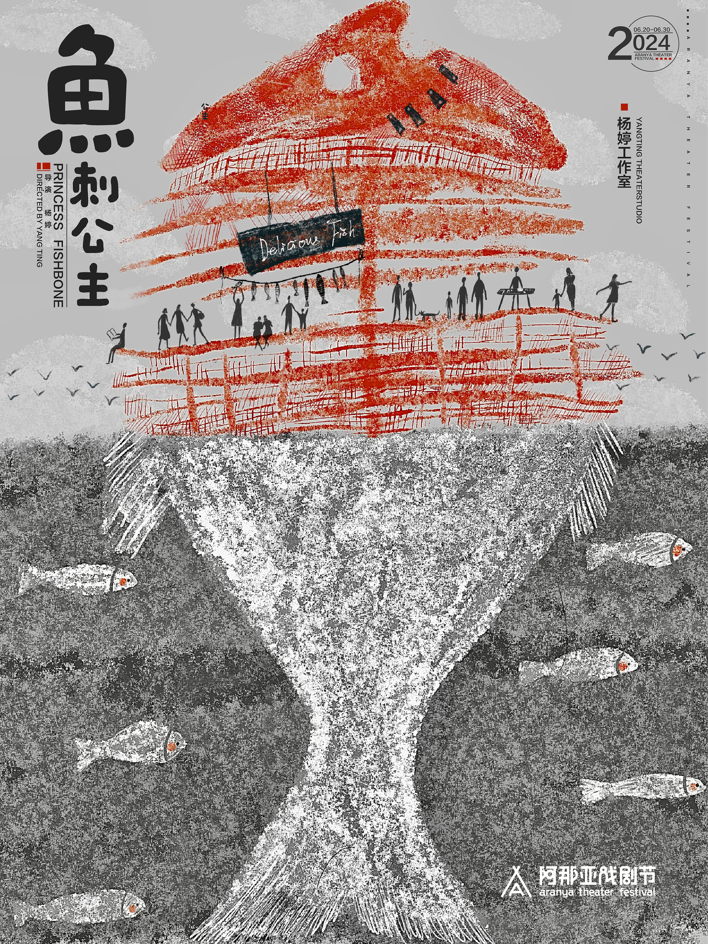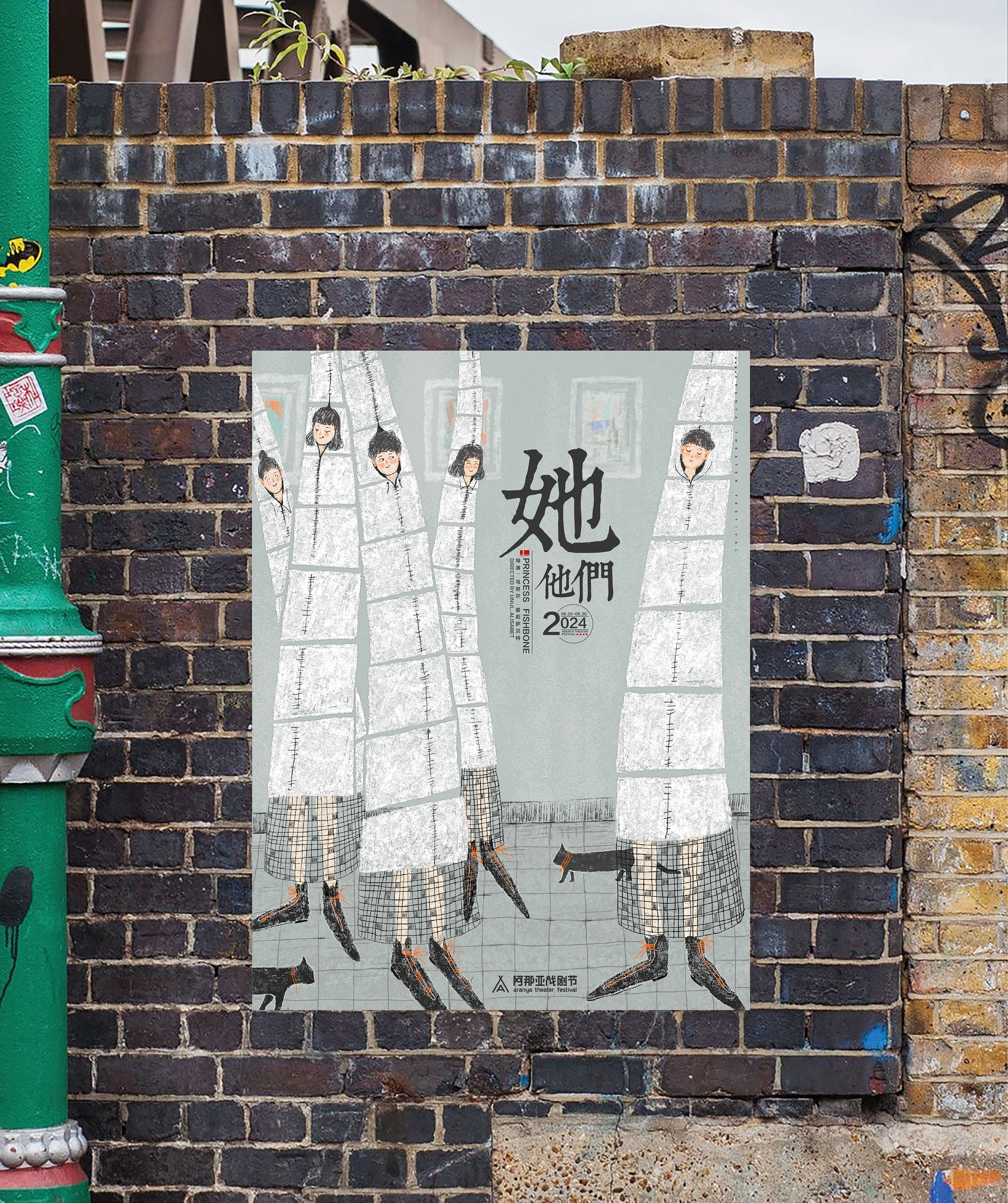 受小红书平台委托为阿那亚戏剧节绘制的一系列海报:《她他们》《魔幻玩具城》《鱼刺公主》《发呆》。