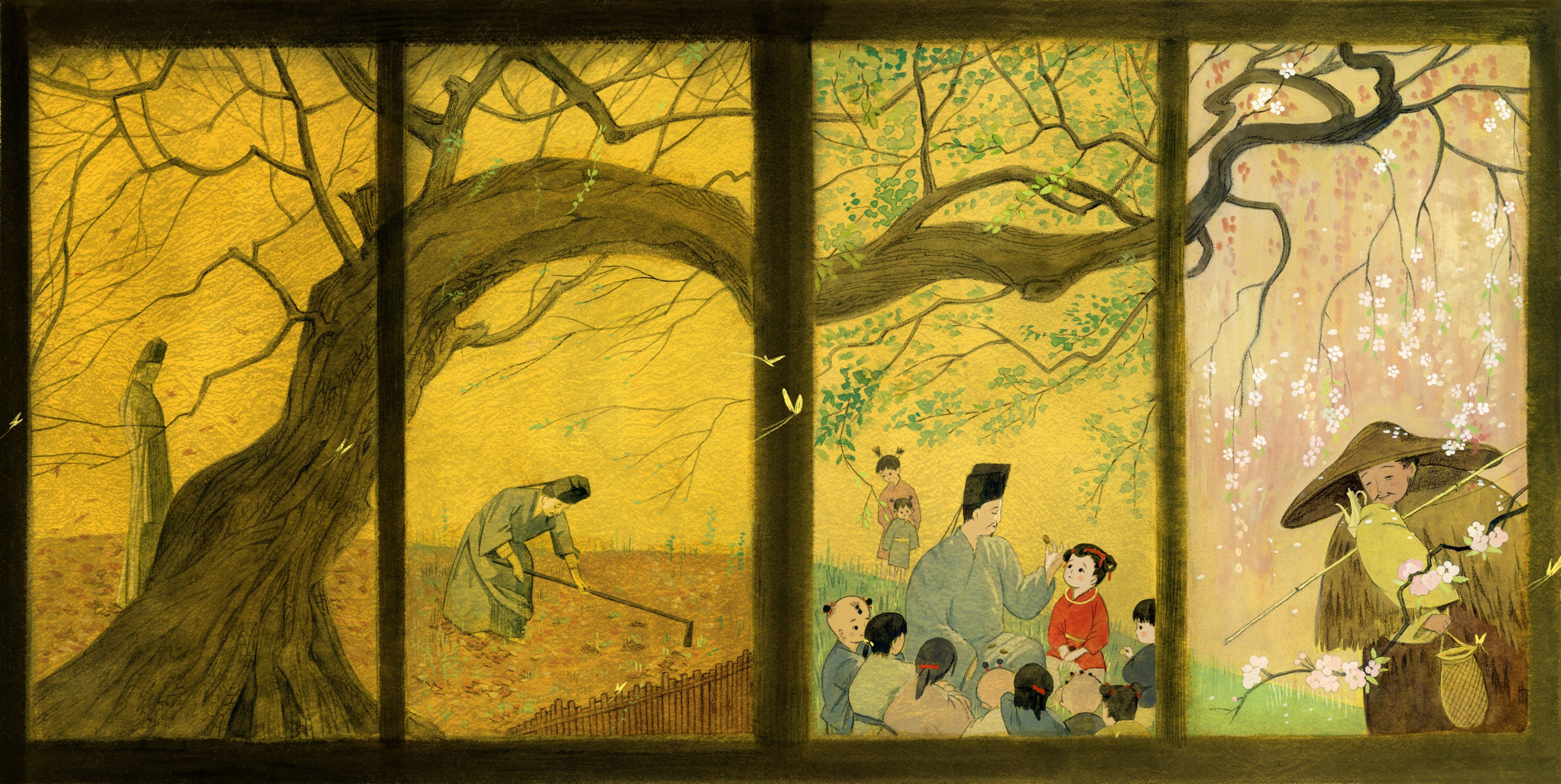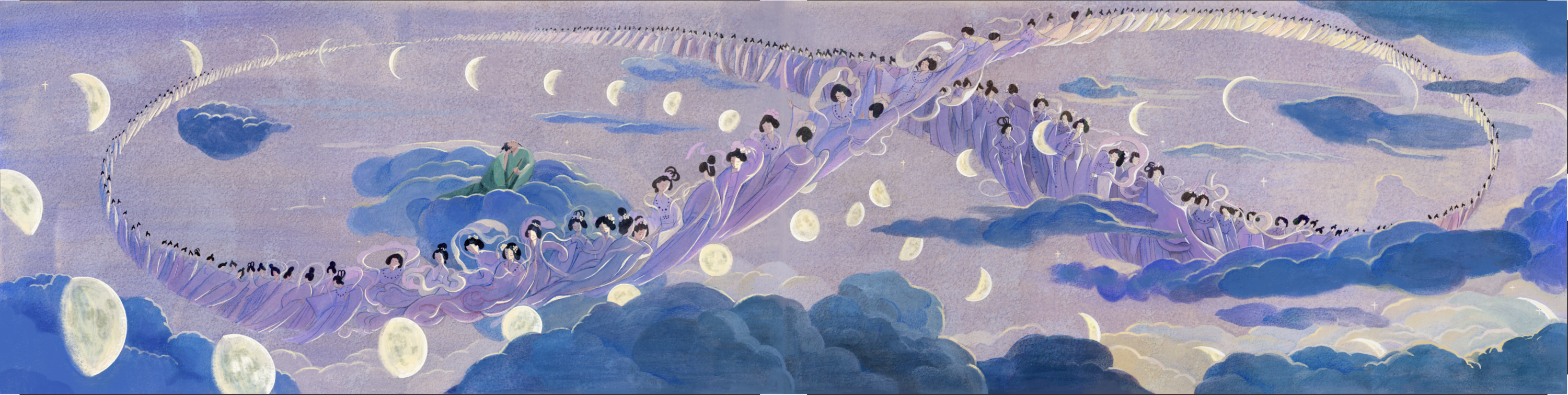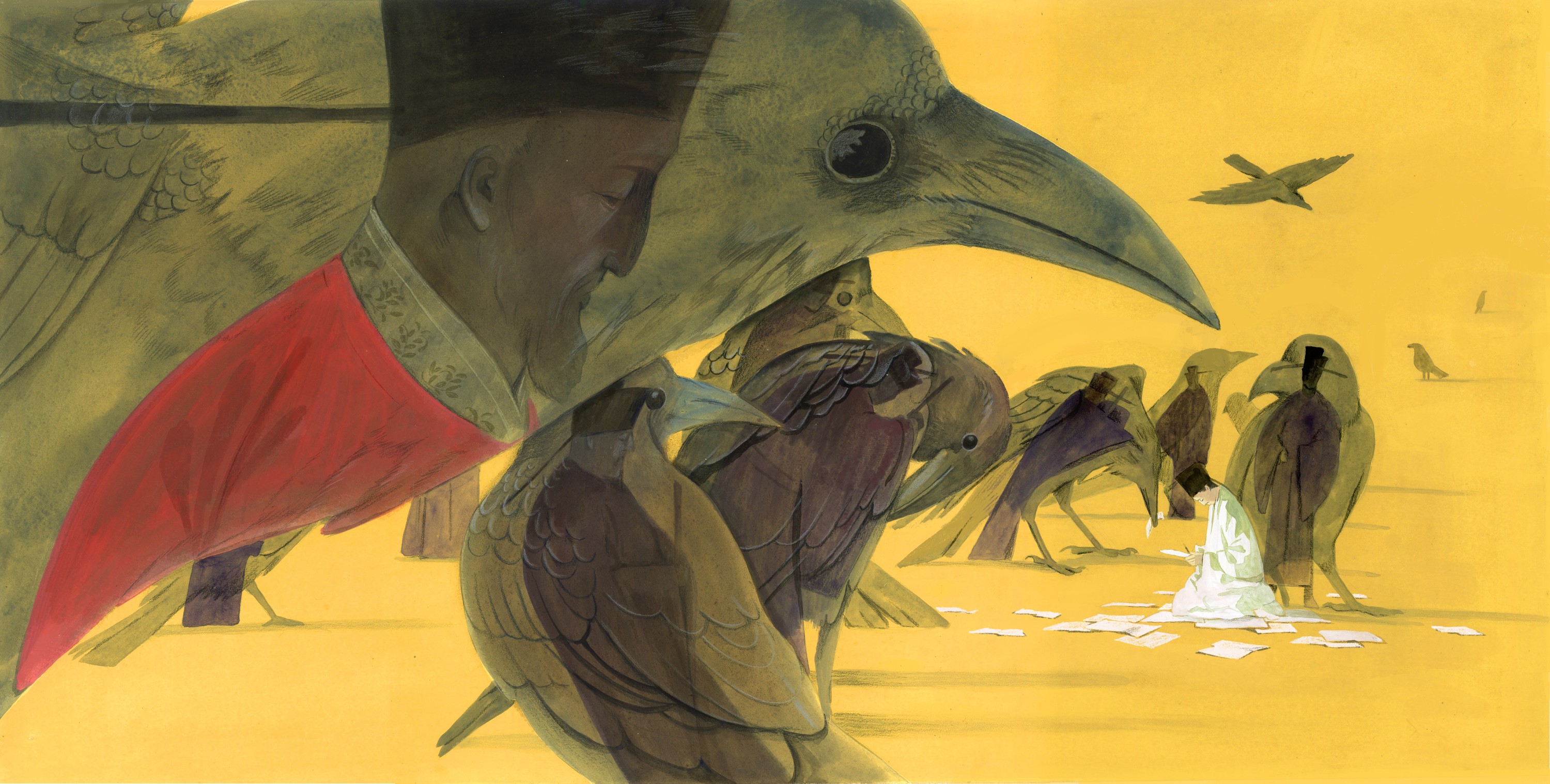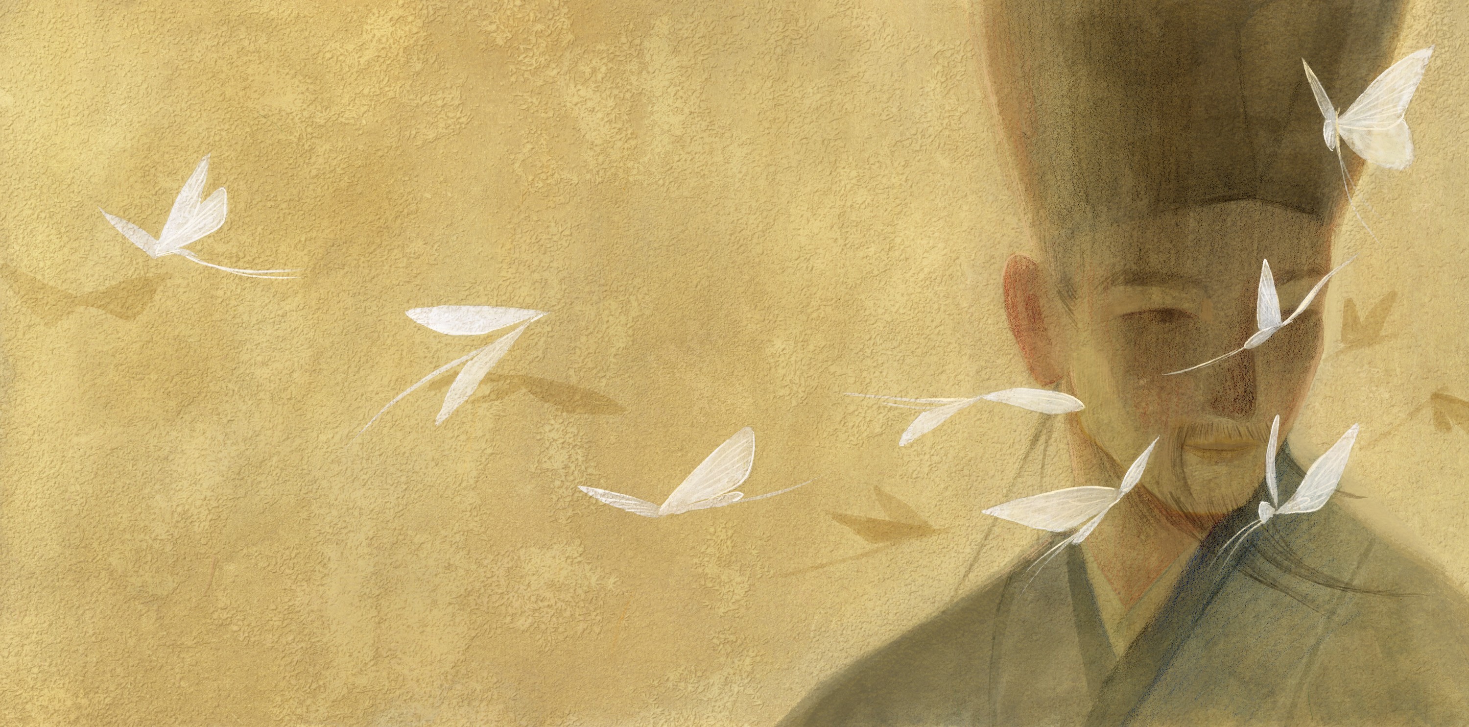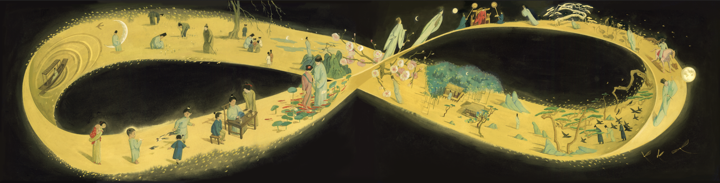 该作品出自绘本《赤壁赋》,以苏轼的千古名篇为创作基底,通过极具东方美学意蕴的水墨笔法,将文学意境转化为流动的视觉诗篇。画面以疏朗的留白和灵动的线条构建出"纵一苇之所如"的空旷江景,苏轼与客泛舟的形象以简约写意的造型融入山水之间。