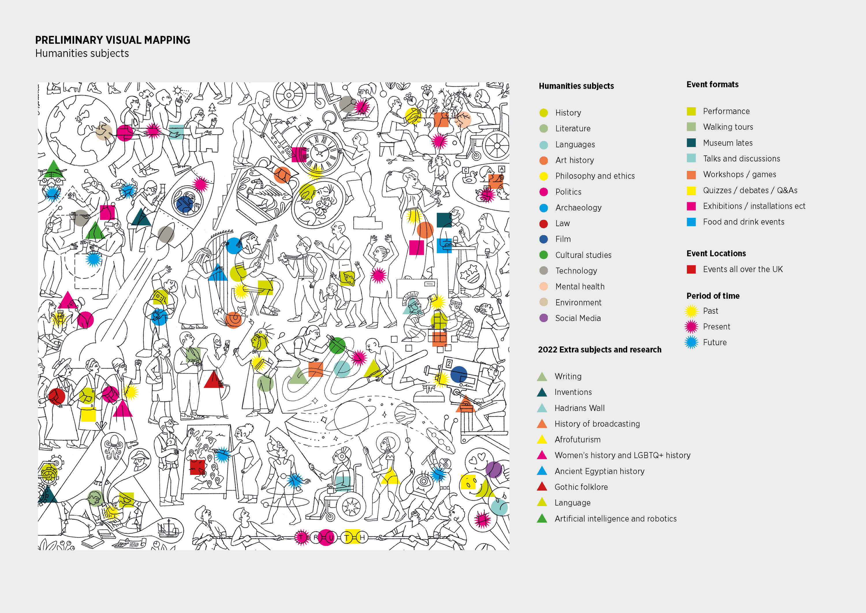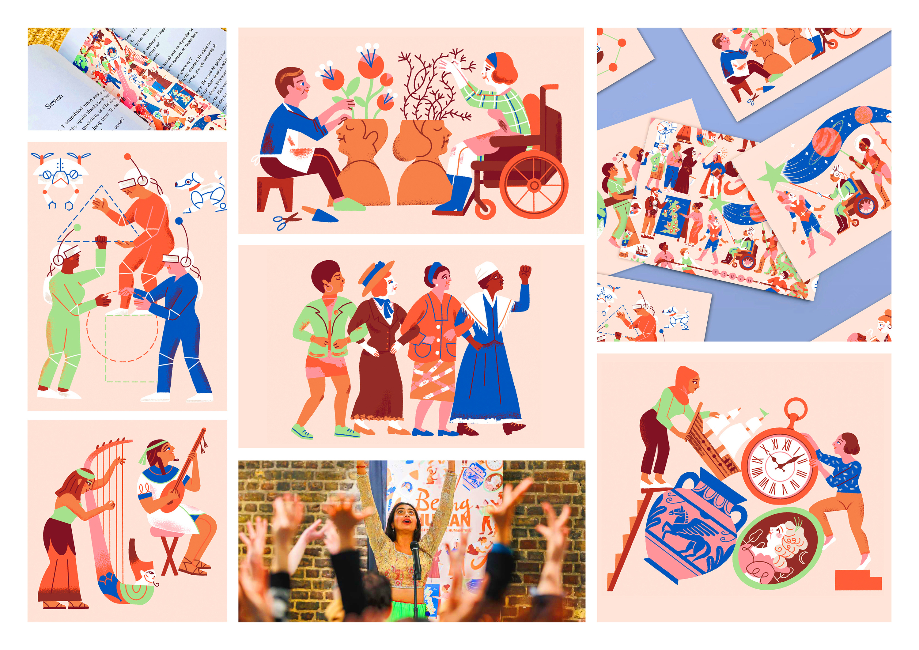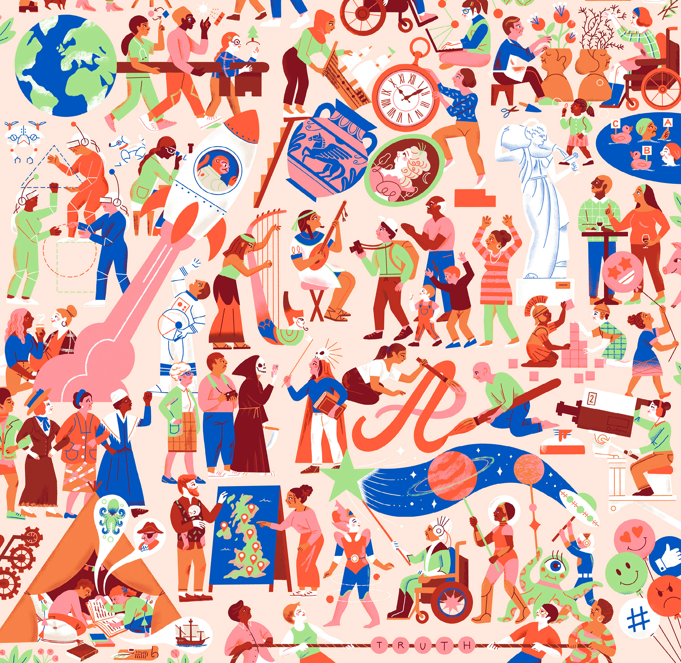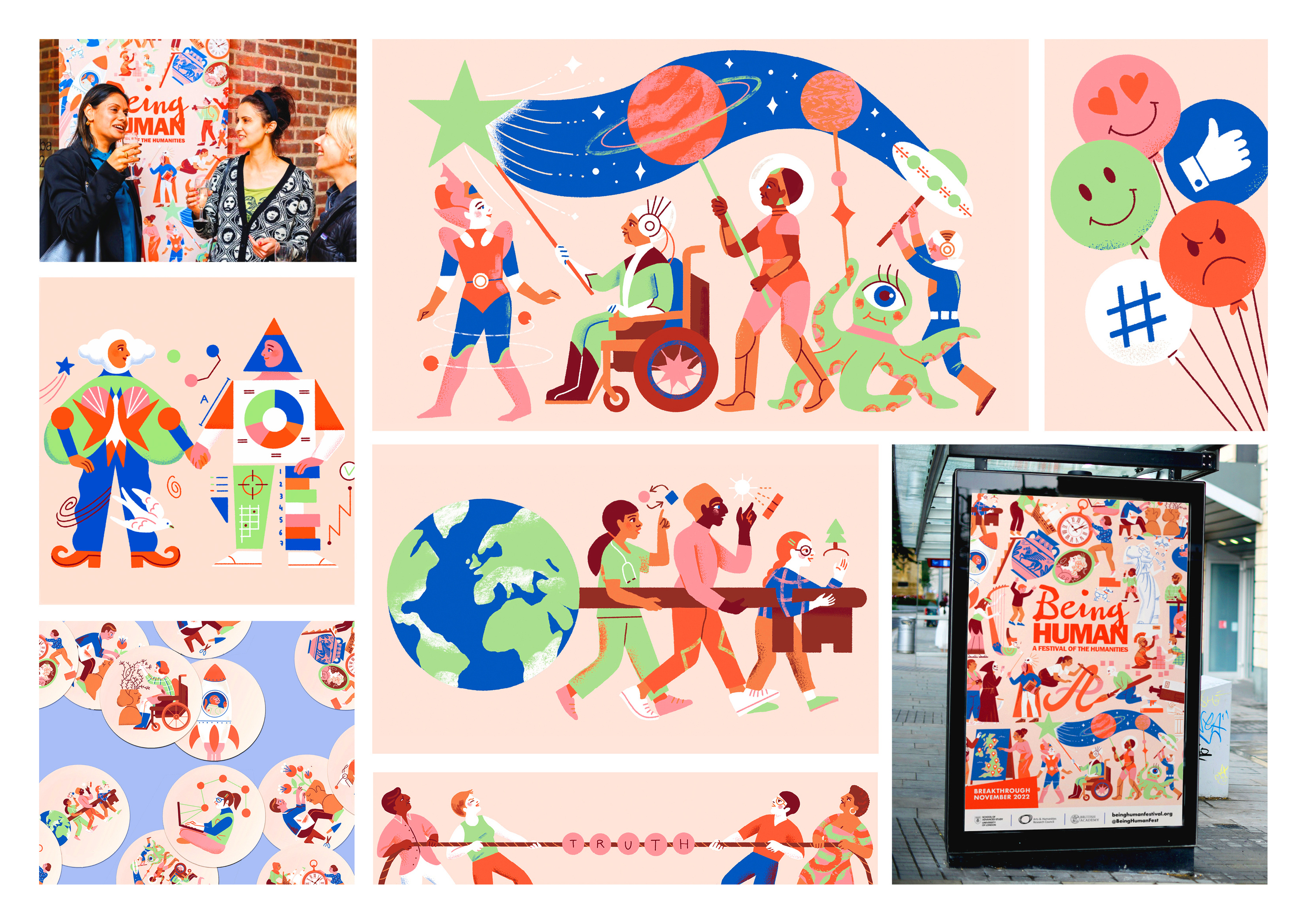 每年11月,“人文节”都会通过各种人文主题和活动来庆祝人类这一最非凡的存在。在过去的几年里,我创作了一个主视觉模块化插图,用于所有的营销材料。我决定接纳各种各样的主题和活动,创造出一个快乐且包容的人群,揭开人文科学的神秘面纱。