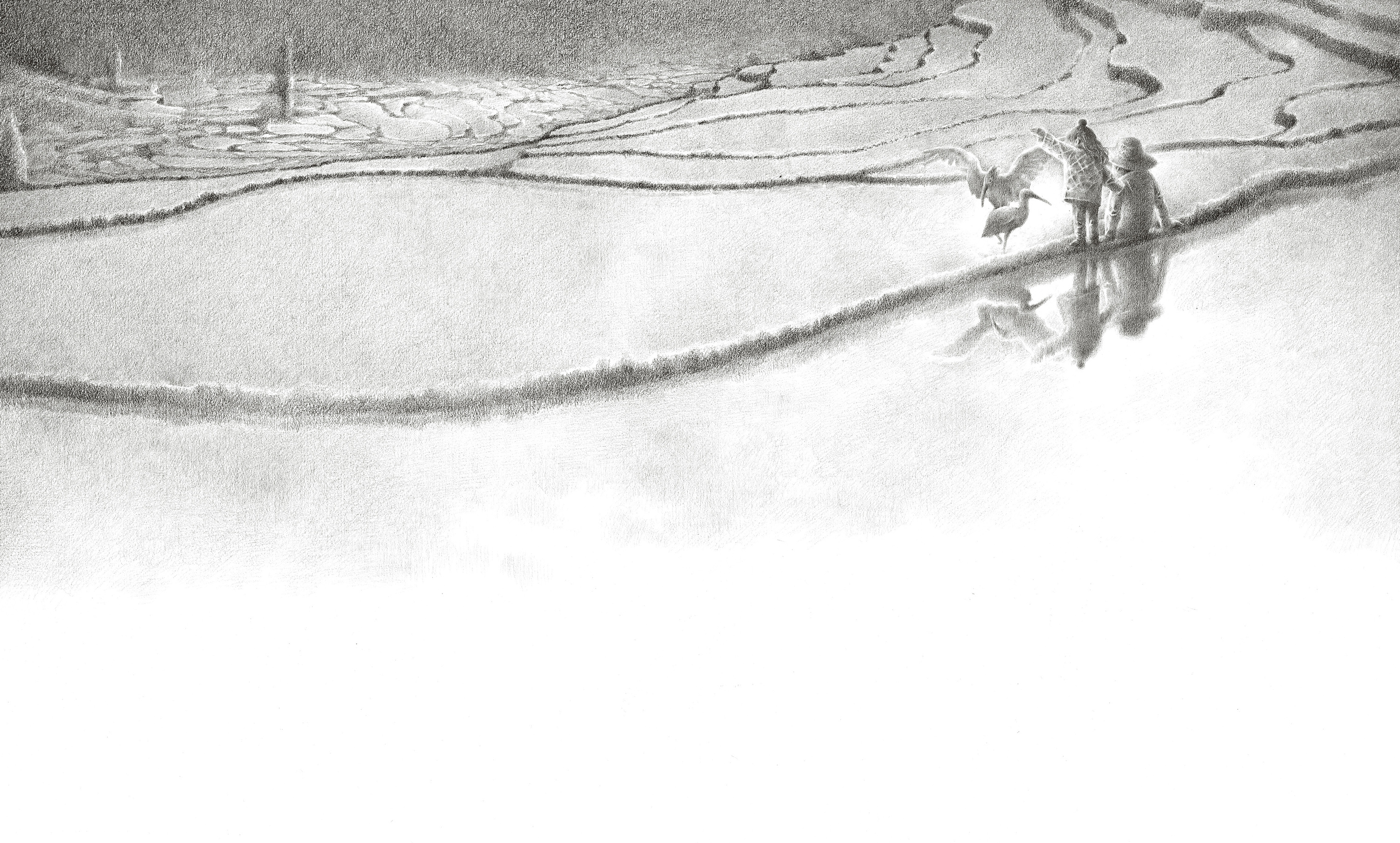 作品采用了石版画的技法,用丰富的视角、宏大的构图展现树林、稻田、农舍的乡村景象,画风细腻,带有诗意,极富感染力,表达对乡村大地上生命力的赞美。故事讲述了陕西洋县姚家沟村一对父女向小朱鹮施救,并守护它长大的故事。