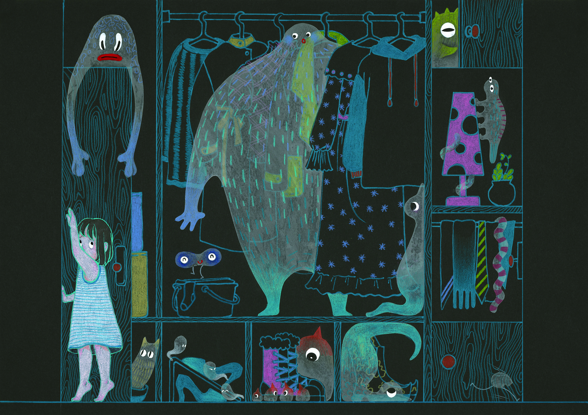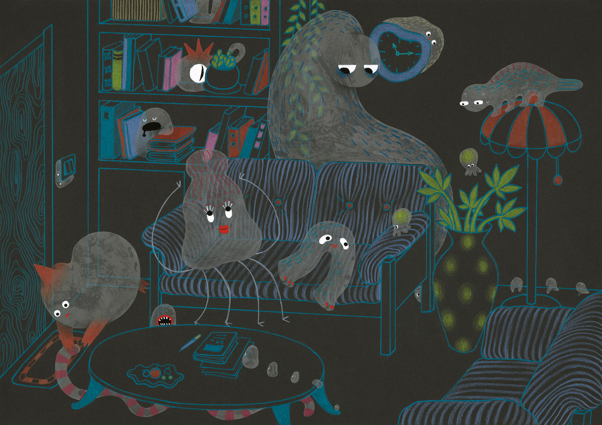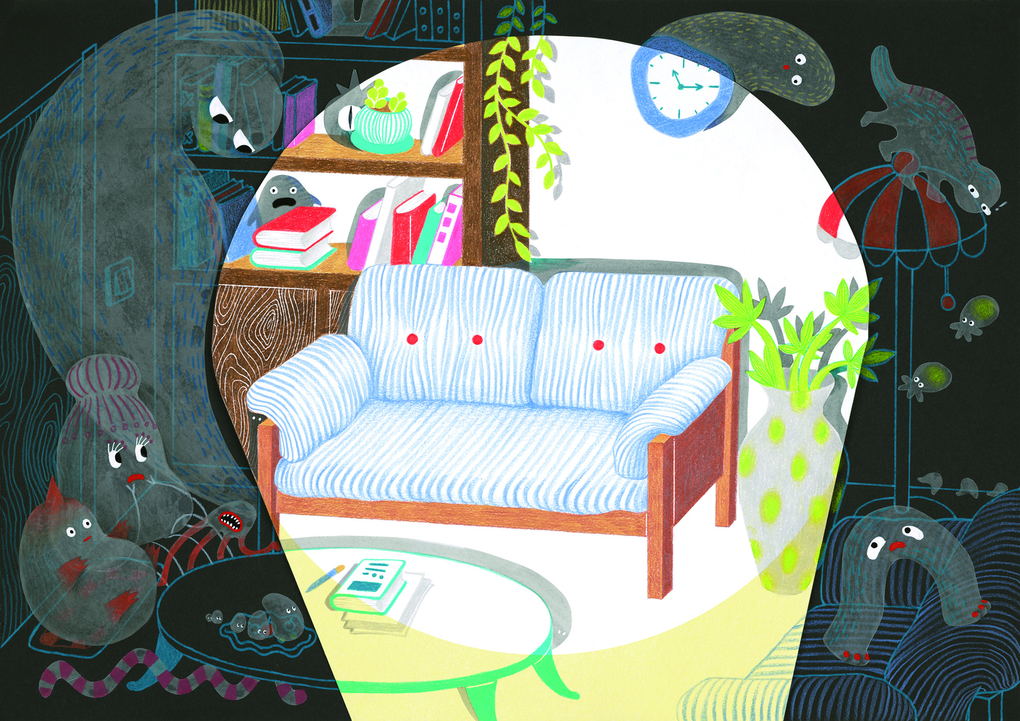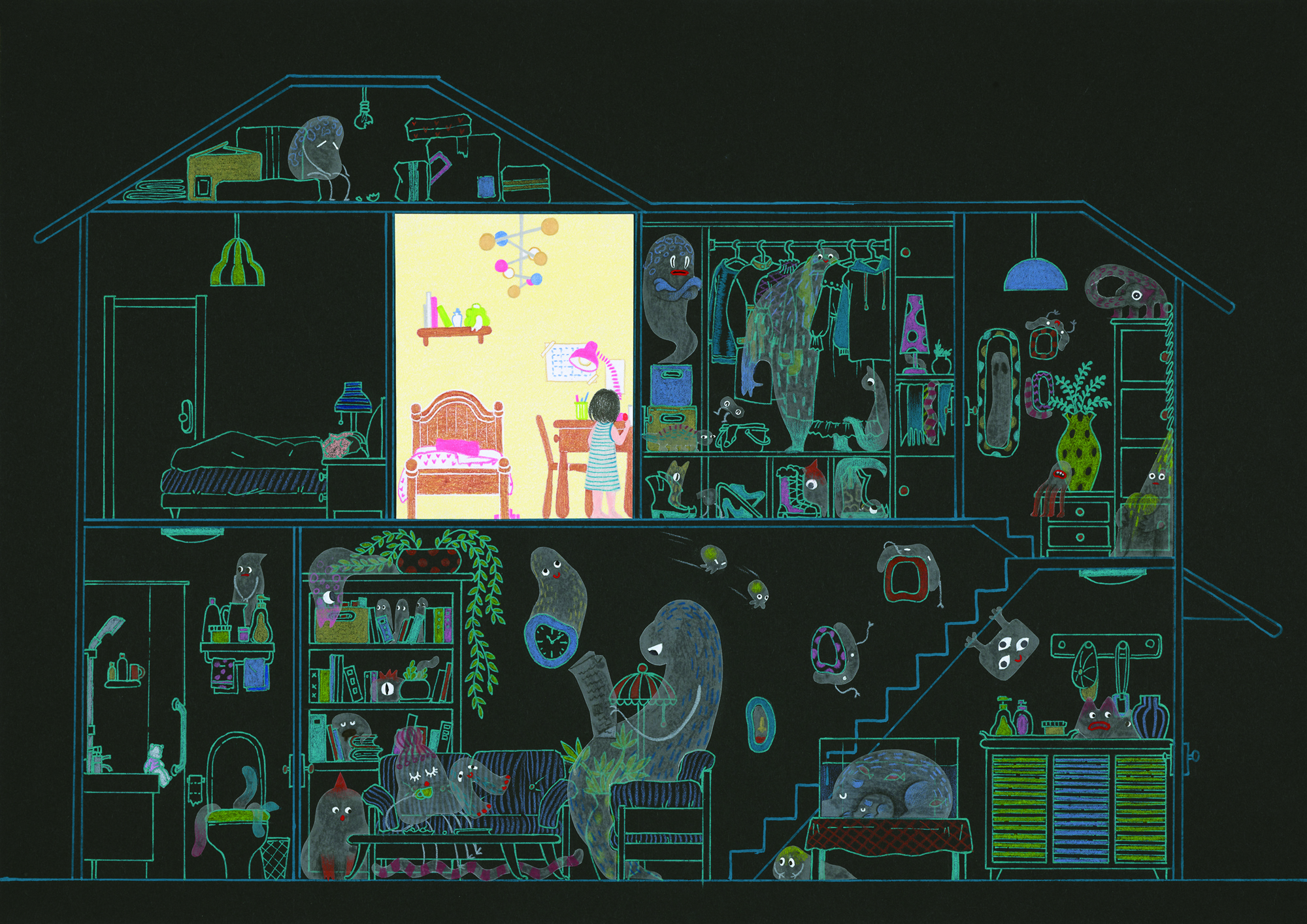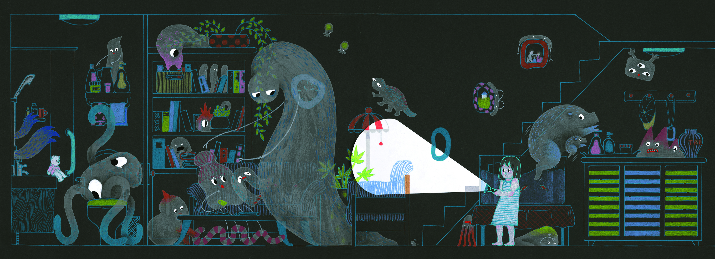 这是一个充满了对黑暗的想象故事,鼓励读者直面对黑暗的恐惧。书中怕黑的女孩鼓起勇气独自下楼寻找玩具小熊。在黑漆漆的房子里,除了小心翼翼的女孩,好像还有别的什么东西充斥在黑暗中,于是她用手电筒四处寻找……