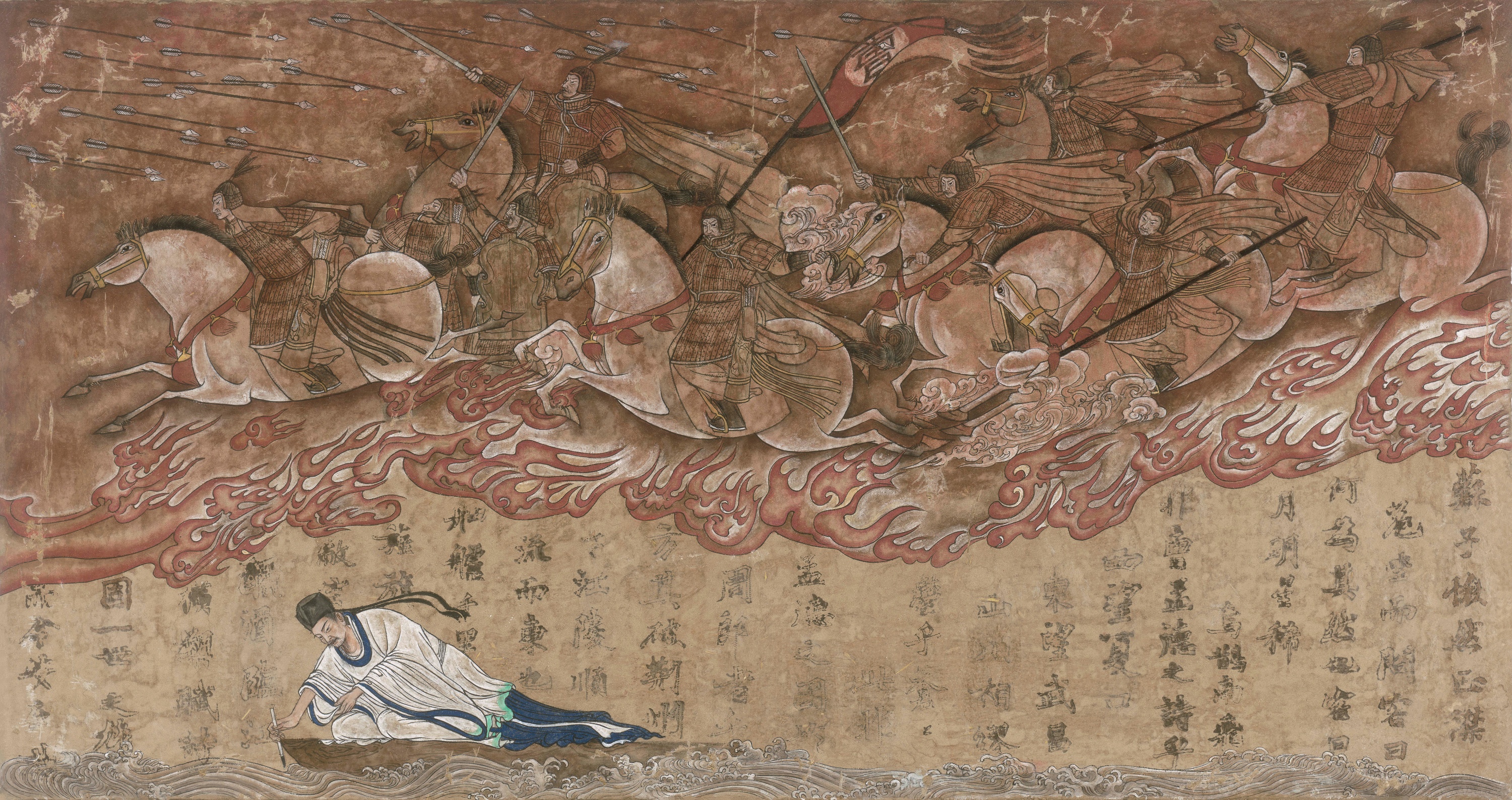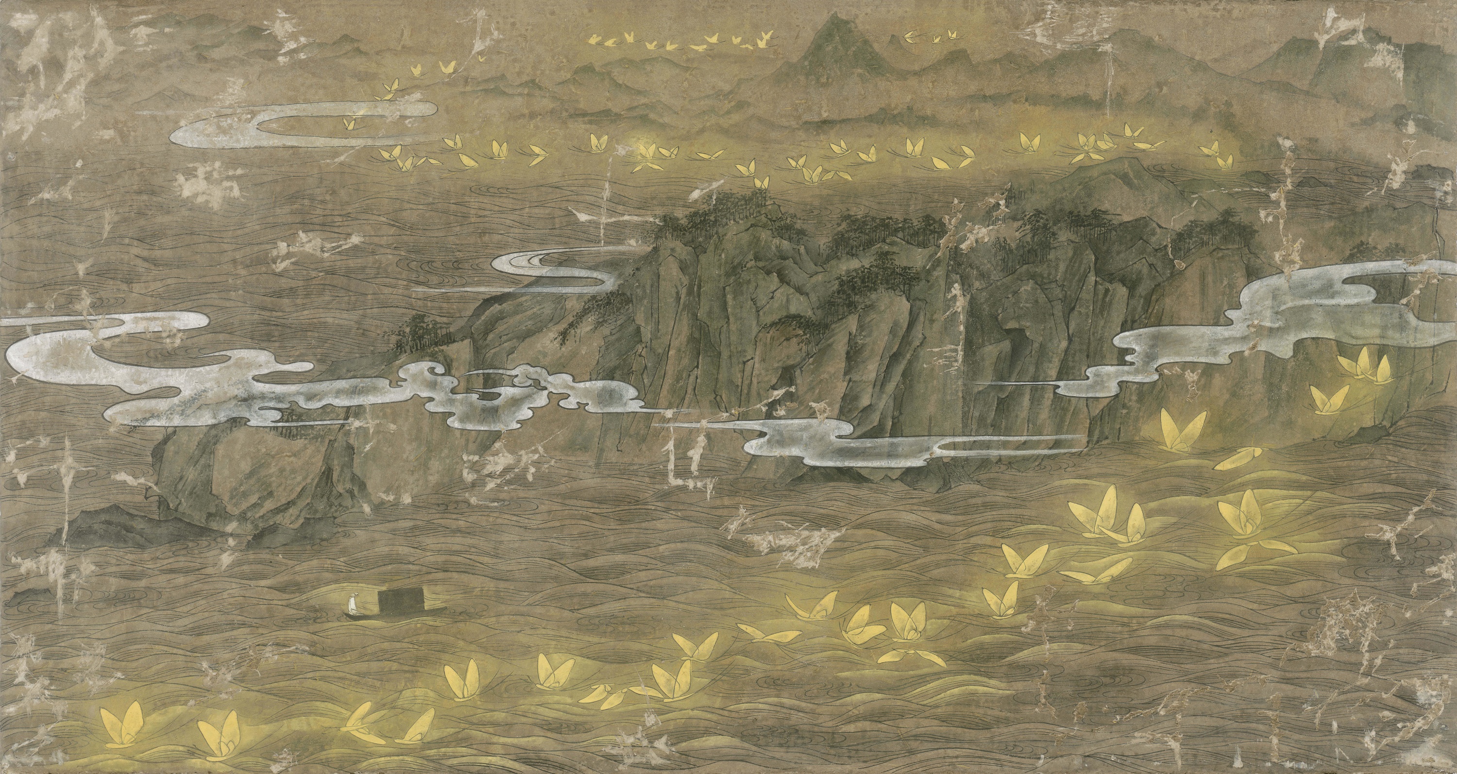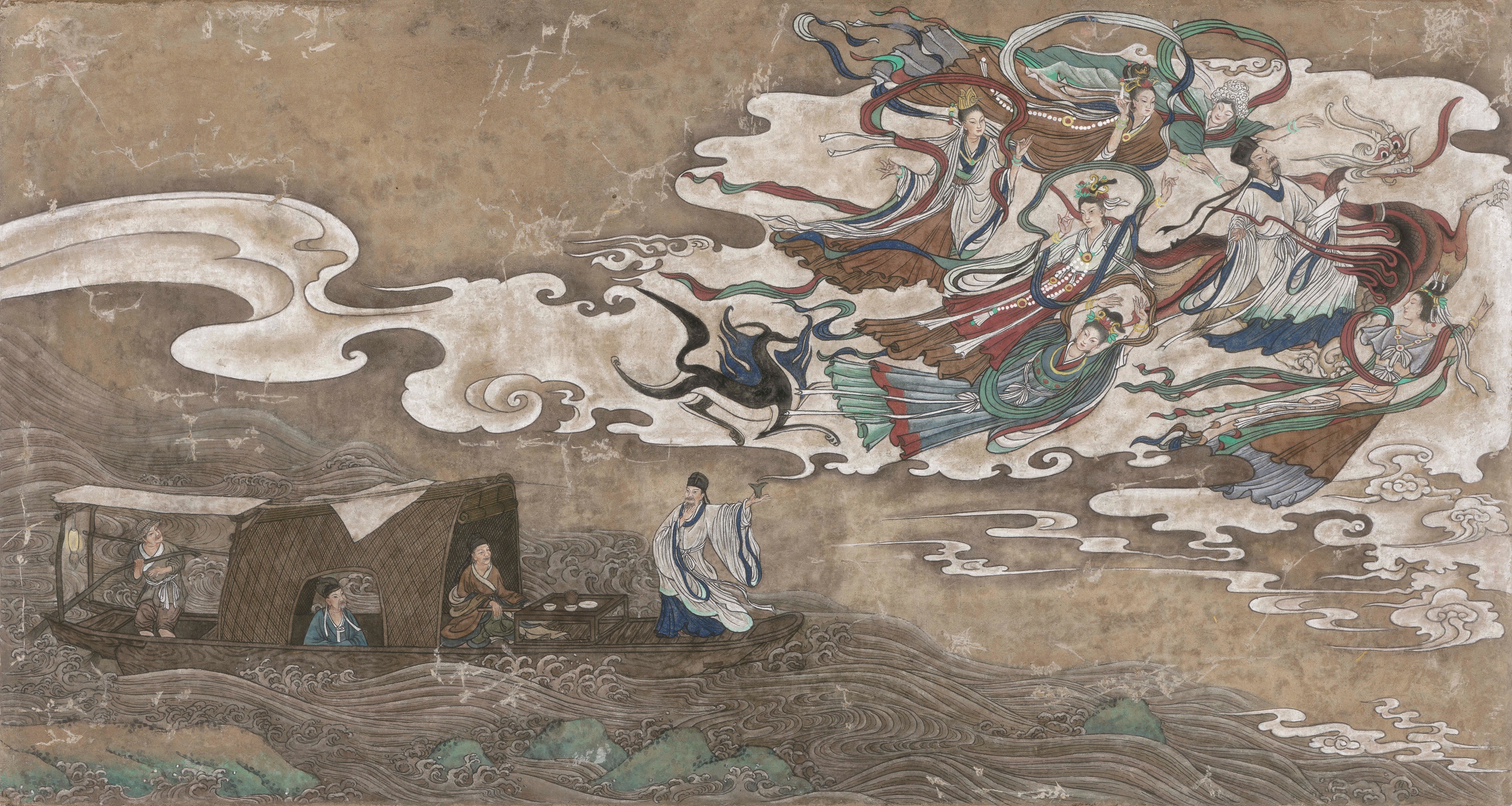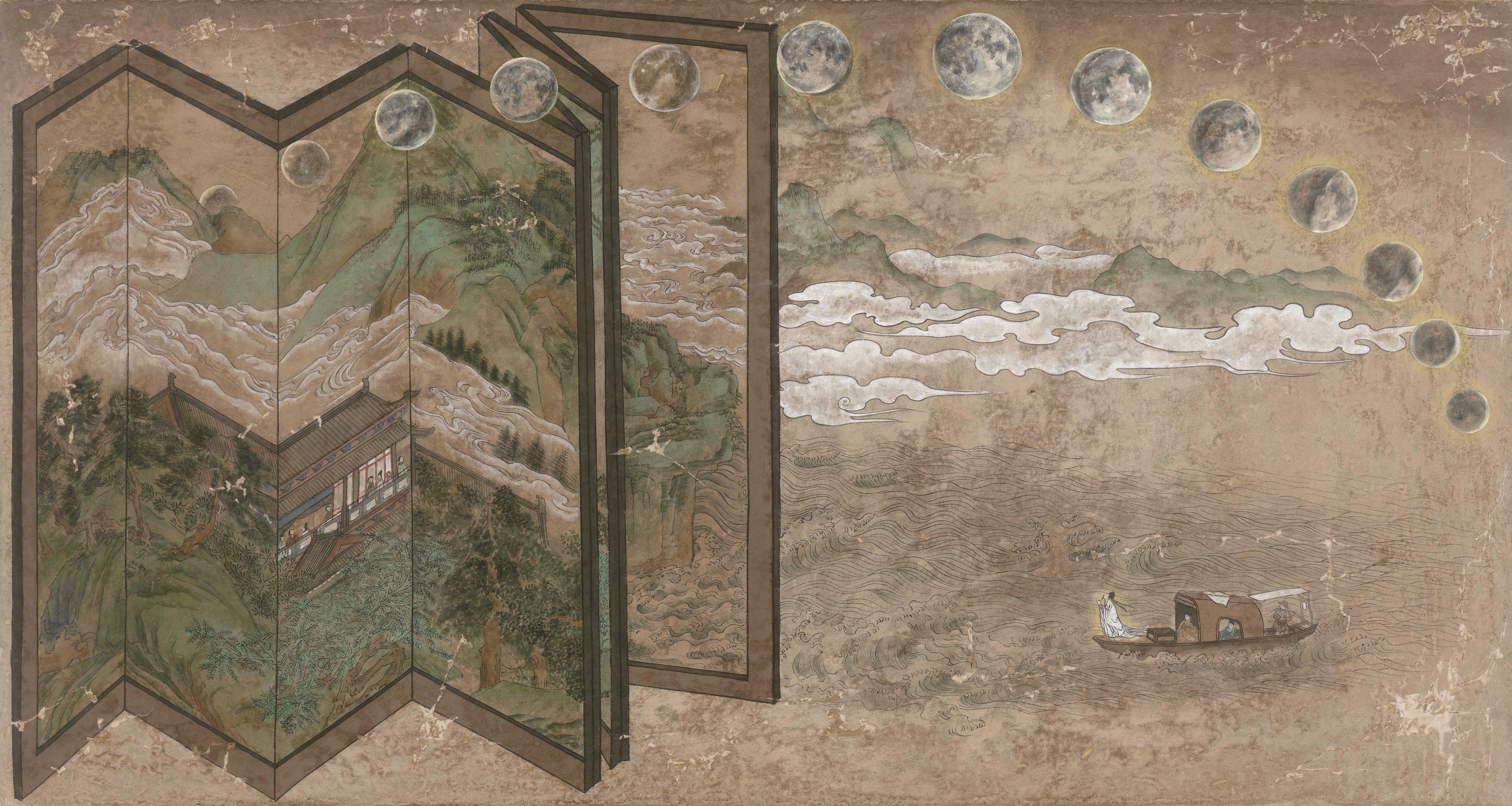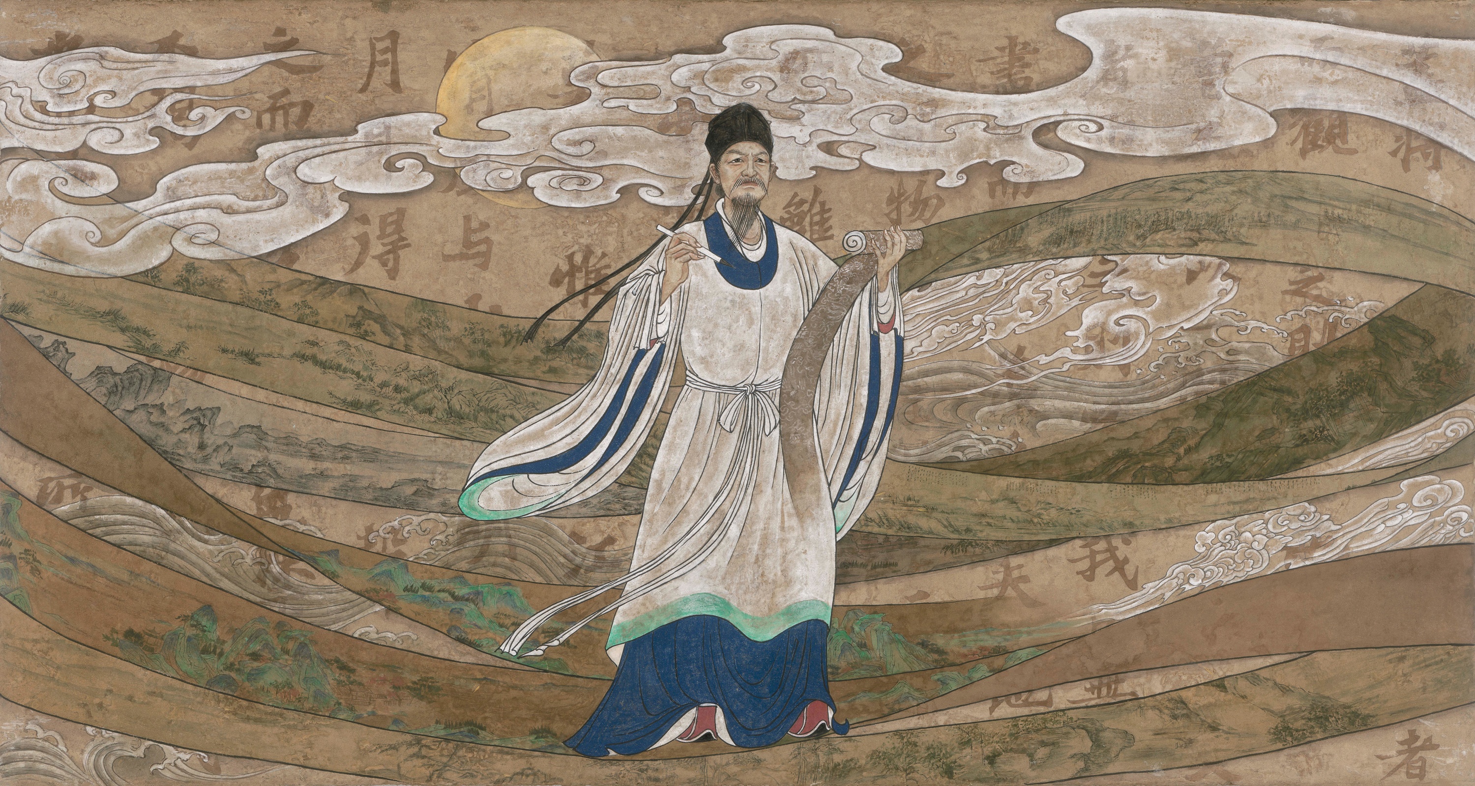 本系列绘画作品以苏轼的《赤壁赋》为文本基础,通过图像叙事的方式,将词赋中的诗意、哲思与情境进行视觉化转译。采用传统水墨与现代媒材结合的技法,展现苏轼夜游赤壁的浪漫意境与哲学思考。